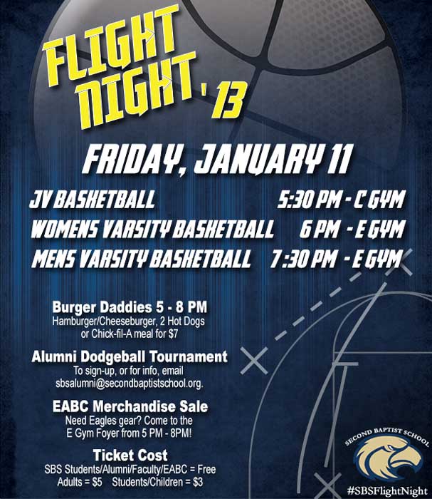 Poster design for Second Baptist School's Flight Night basketball event. Designs were also created for the school's website and Facebook page.